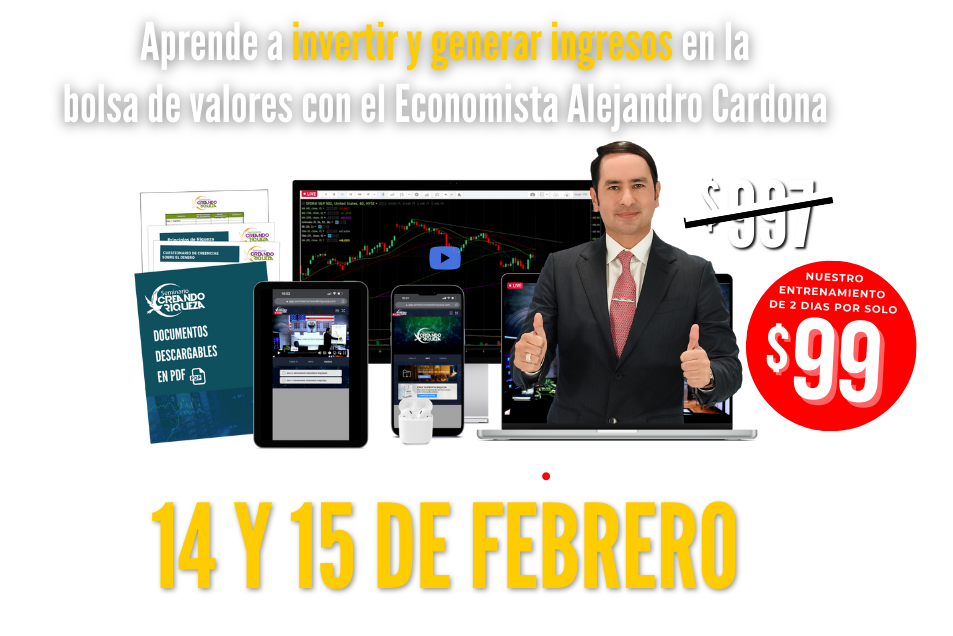 Nacido en Colombia, Alejandro Cardona es un visionario en el mundo de las finanzas. Es un economista con MBA de Tulane University, especializado en el mercado bursátil y Option Trading. Fundador del Seminario Creando Riqueza, Alejandro se ha ganado un nombre por sus logros impresionantes en rentabilidad y su habilidad para comprar y vender en los momentos más oportunos. Ha sido destacado en múltiples noticieros por sus estrategias de inversión. Además, Alejandro ha capacitado a miles a alcanzar su libertad financiera, aportando significativamente a la economía y siendo un referente en los medios de comunicación. Es autor de tres libros, incluyendo el best-seller en Amazon “Crea Tu Propia Riqueza”.